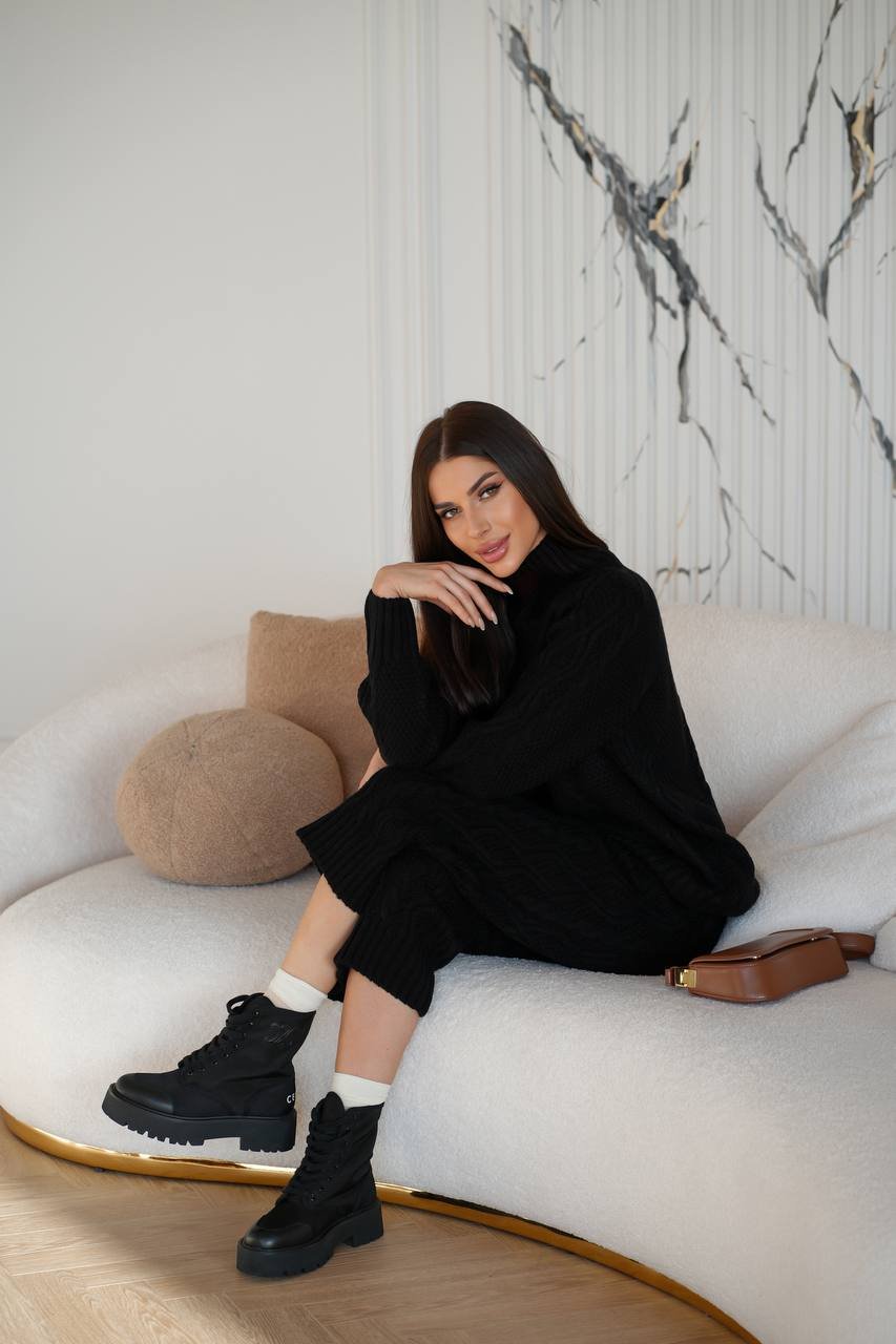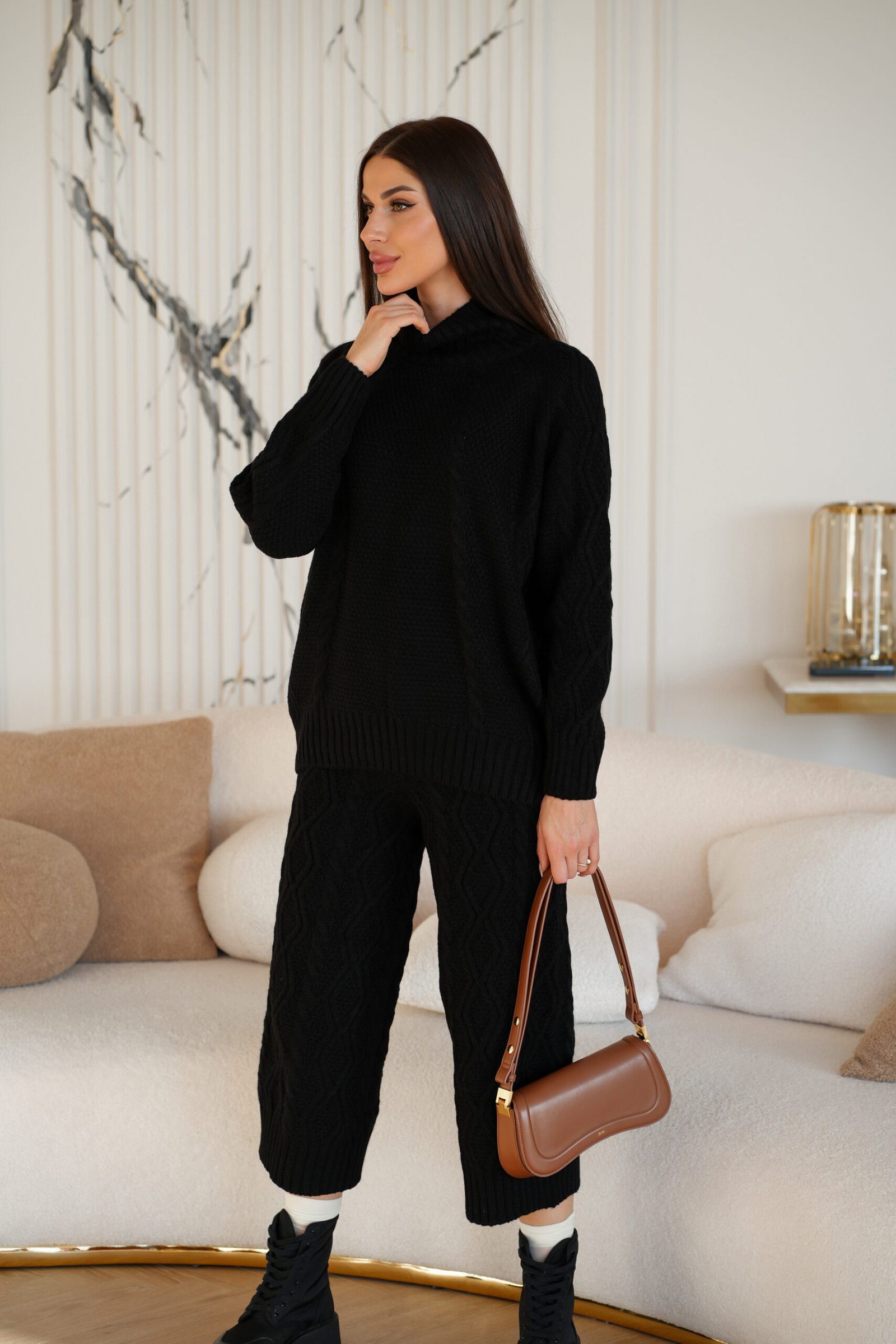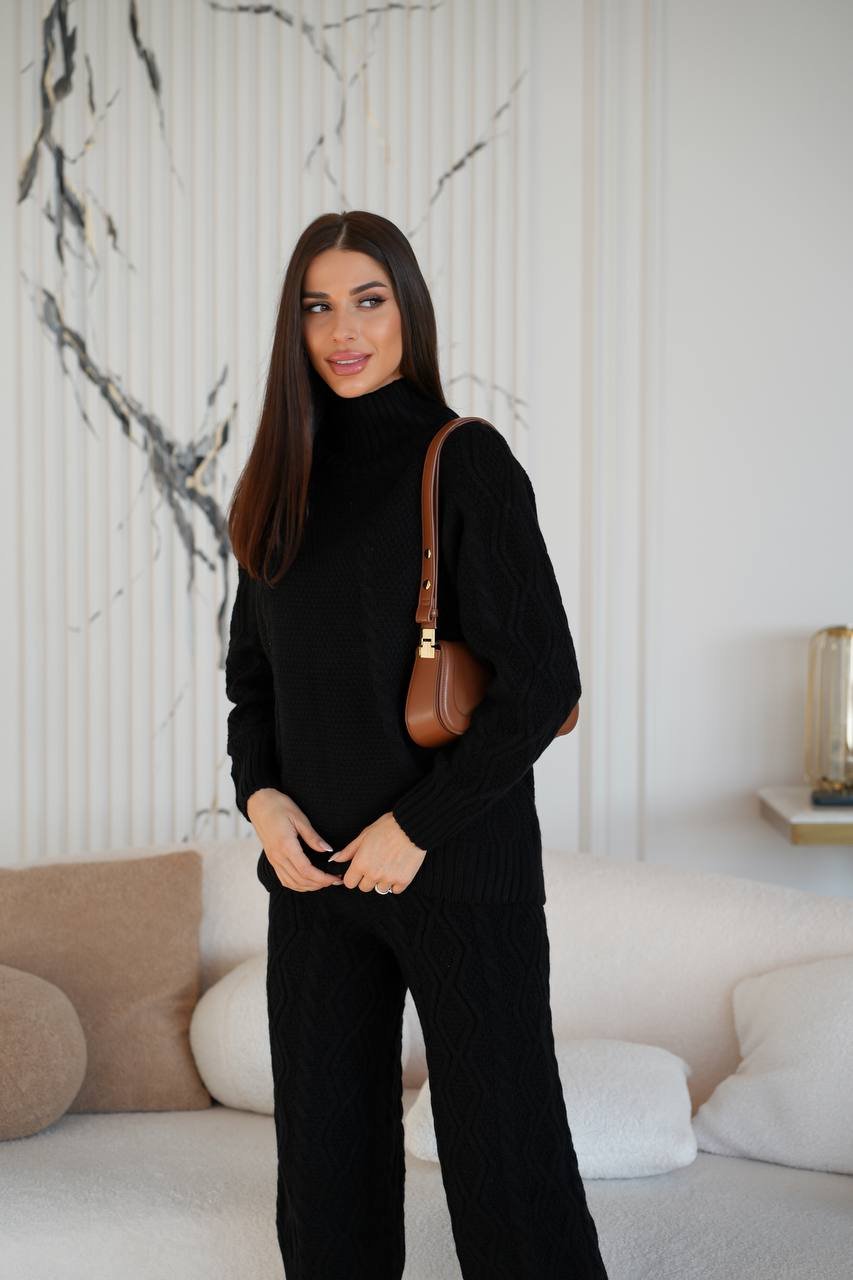 Knitted suit with braided culottes is an elegant and stylish set that combines modern design and comfort. The suit consists of a knitted jacket and culottes with a “braid” pattern. The “braid” knitting adds textural interest and sophistication to the look. The culottes made of lightweight material create the impression of lightness and allow easy movement, which makes this suit ideal for comfortable wearing in any situation.